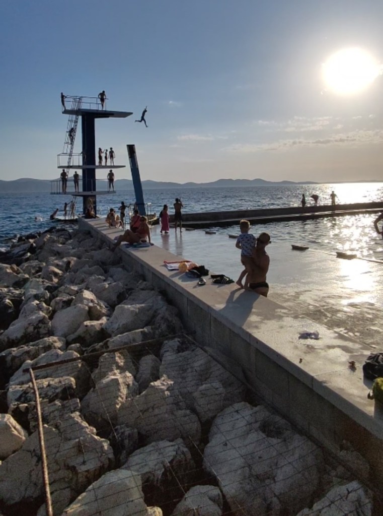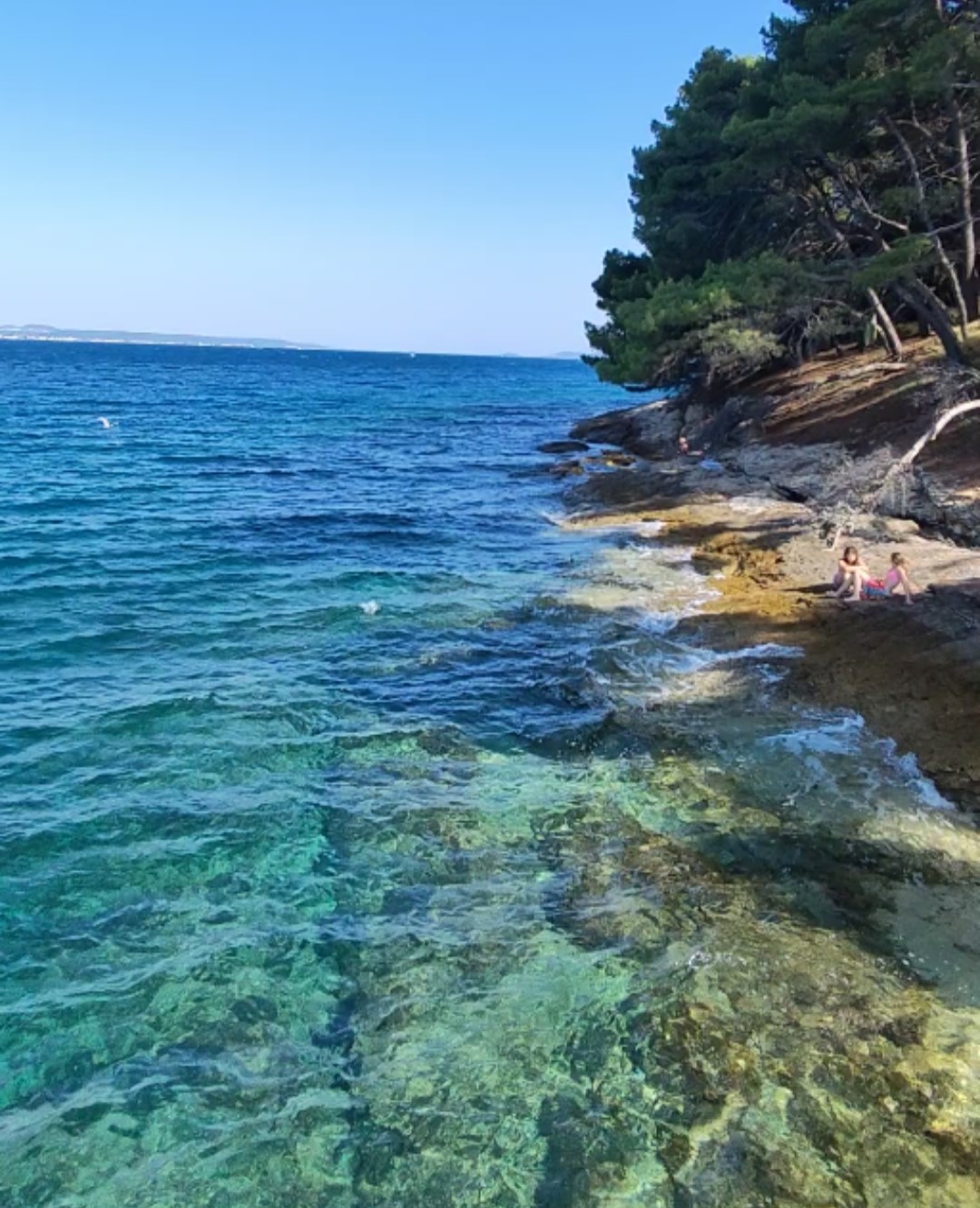 La prima cosa che abbiamo fatto, appena lasciate le valigie nella nostra casetta, è stata – ovviamente – correre verso la spiaggia. Senza troppe ricerche, ci siamo fermate alla prima che abbiamo trovato: Kolovare Beach. Kolovare è la spiaggia cittadina per eccellenza: frequentata sia dai turisti che dagli abitanti di Zara, è facilmente raggiungibile dal centro e dotata di tutti i comfort, mantenendo comunque un’anima autentica.